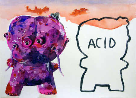 I spent this summer in Berlin and for the show did two watercolor drawings. Basically I separated two elements which I would normally unite in one drawing. In the first drawing I only did the monster figure by itself and the second I did the background only: a bucolic Swiss Mountain landscape. I then packed up the drawings and sent them to Cody to finish in his own way and as he saw fit. I haven’t seen them since and there was no talk between us about the content of the work. So I am curious to see what he added and how they have turned out.