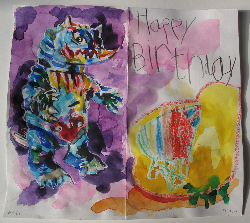 Md 61 (Happy Birthday), 2013, Pencil, Watercolor, Gouache, oil crayon on children’s drawing, 21 x 23 cm